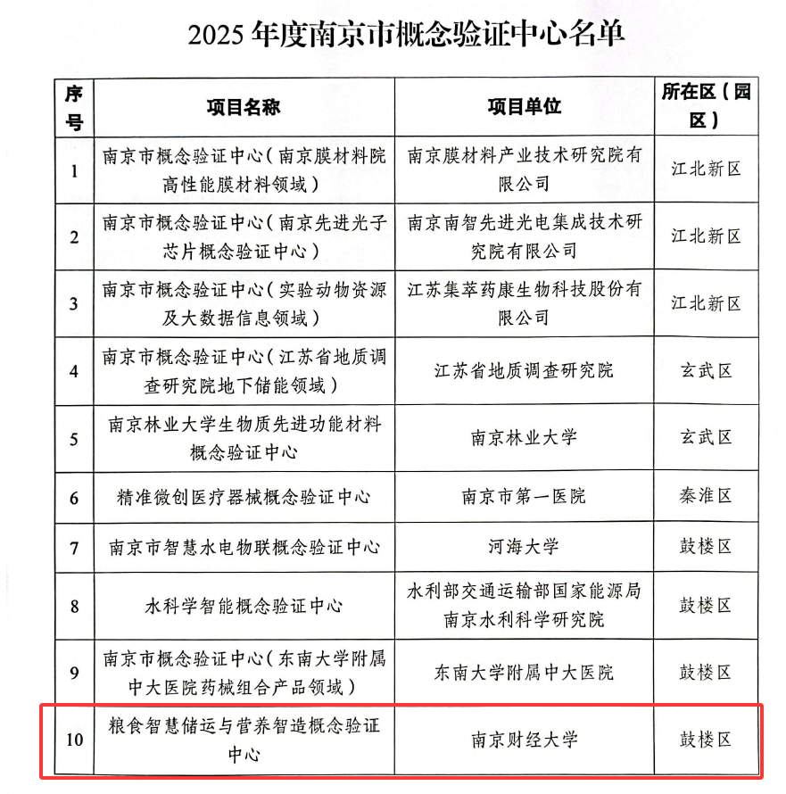 近日,南京市科学技术局正式发布《关于公布2025年度南京市概念验证中心名单的通知》(宁科通〔2025〕73号)。我校申报的“粮食智慧储运与营养智造概念验证中心”经单位申报、主管部门推荐、专家评审、社会公示等程序,成功获批立项。这是我校首次入选南京市概念验证中心建设项目,标志着学校在推动科技成果转化、服务地方产业发展方面取得了新的重要突破。
